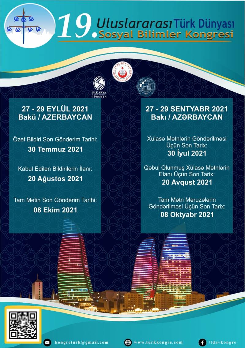 Sizleri, 27 - 29 Eylül 2021 tarihleri arasında, Azerbaycan Devlet İktisat Üniversitesi ev sahipliğinde, Bakü’de gerçekleştirilecek olan 19.Uluslararası Türk Dünyası Sosyal Bilimler Kongresi’ne davet etmenin heyecanı ve mutluluğu içindeyiz.